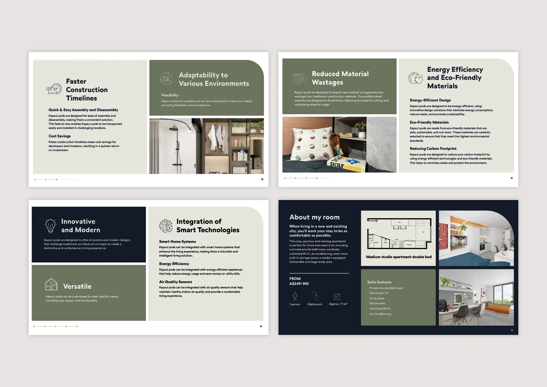 I was engaged to design and layout a tender presentation for Kapsul Housing as part of their bid for a multimillion-dollar contract with a leading Melbourne university to deliver modular student housing.